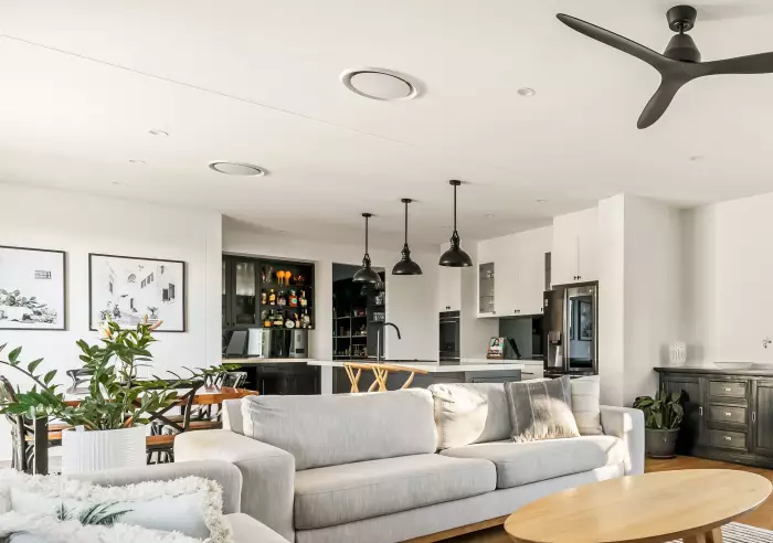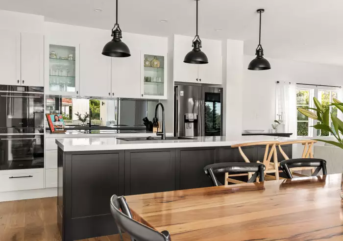 At the heart of the home lies a modern kitchen, designed for both daily living and entertaining. Featuring 60mm stone benchtops and a spacious island with striking matt black fixtures, the kitchen is equipped with a full suite of premium appliances including a Smeg 900mm induction cooktop, integrated dual pyrolytic ovens, and a Miele dishwasher — all complemented by custom 2 Pac shaker cabinetry. Thoughtfully integrated, a bar nook with Vintec wine fridge provides the perfect touch for hosting or unwinding. The expansive butler’s pantry functions almost like a second kitchen, with generous bench space, custom cabinetry, a secondary fridge, dishwasher, and sink all ensuring meal preparation remains effortless and the main kitchen clutter free and ready for entertaining with friends and family.