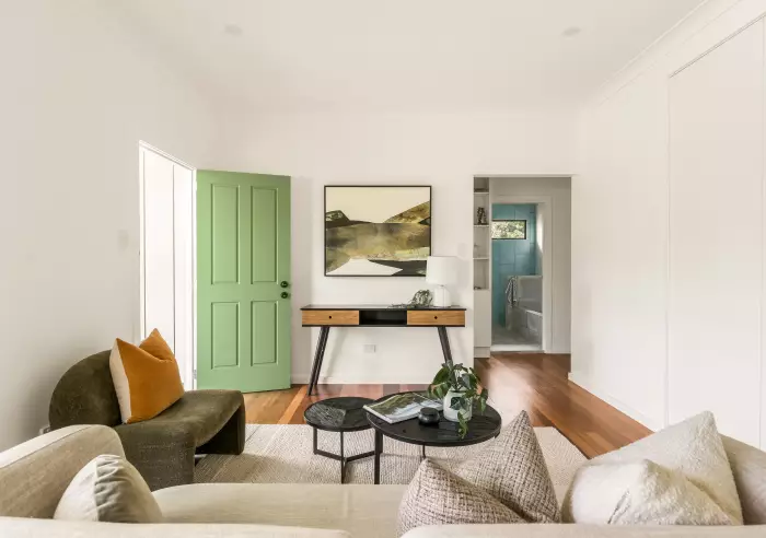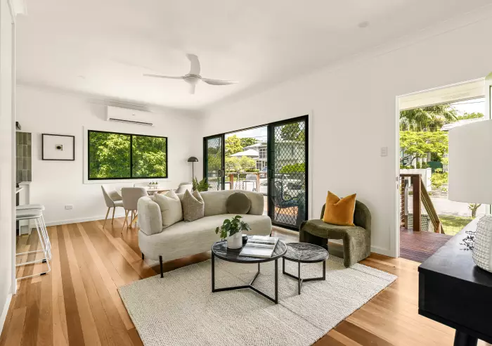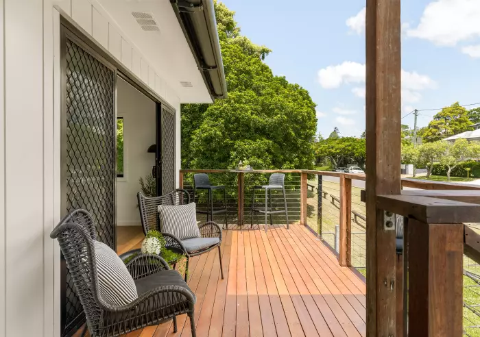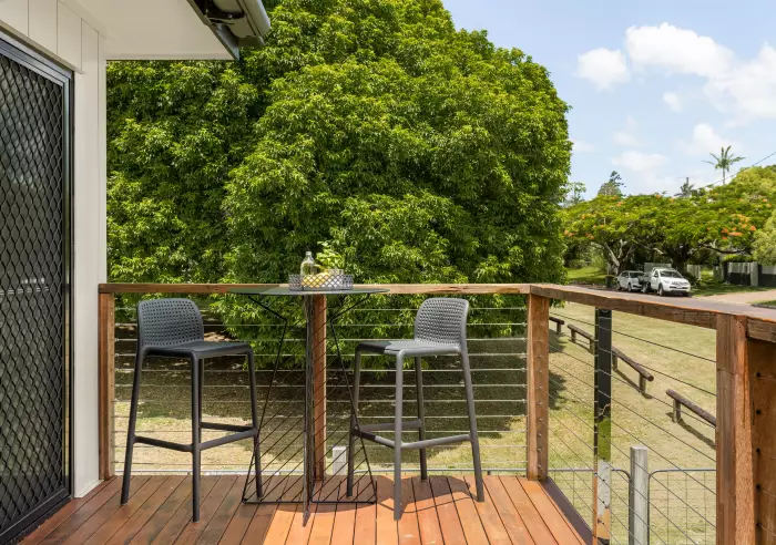 The living space spills through sliding doors onto an inviting front deck with an awning, creating seamless indoor-outdoor living. Whether it’s morning coffee in the sun, a quiet evening outdoors, or entertaining friends and family, you can enjoy the leafy front yard and take in views across to Frank Roberts Park, making the most of this peaceful park-side setting.