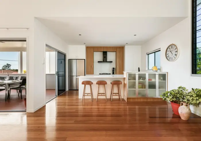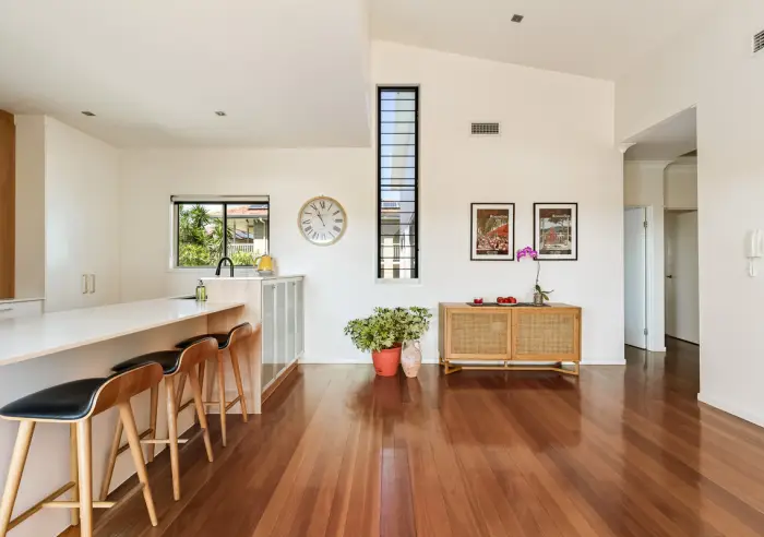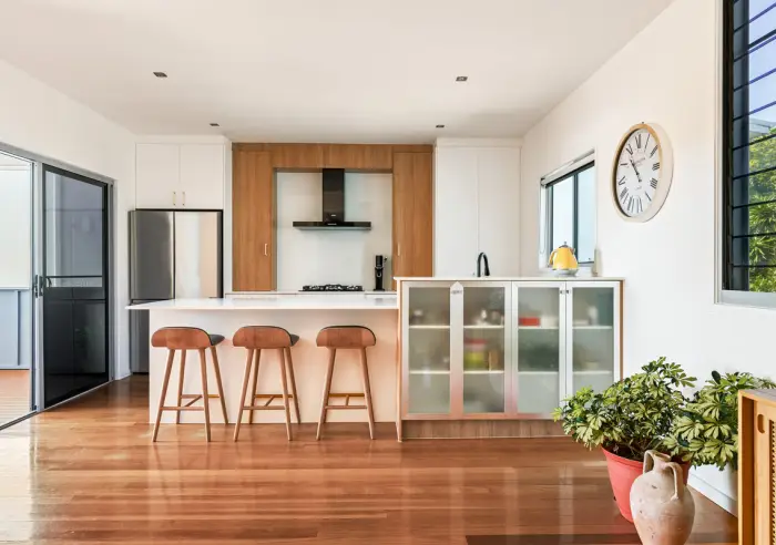 Upstairs, a spacious open-plan living, kitchen & dining space forms the heart of the home. Polished hardwood floors and raked ceilings enhance the sense of scale, while natural light fills the room, creating a warm and inviting environment for everyday living.