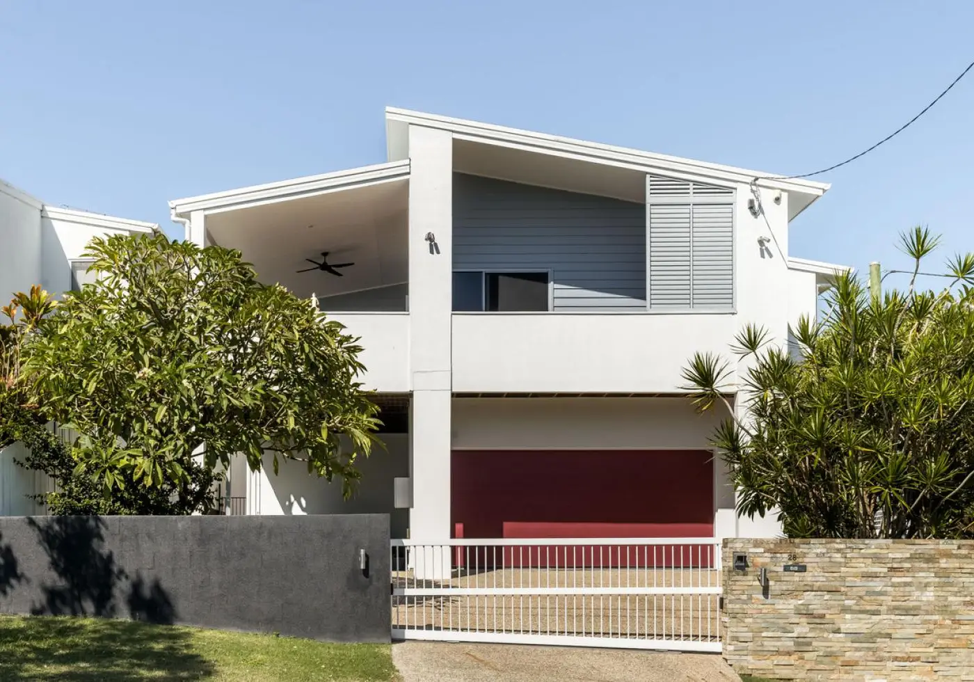 From the street, the home makes an immediate impression. Clean lines, a striking stacked stone feature, and gated entry create a strong sense of arrival, while the elevated design captures natural light, breezes, and a leafy suburban outlook.