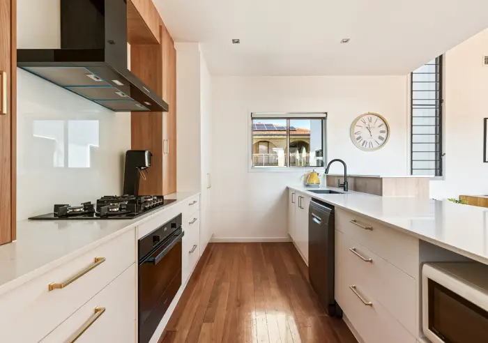 • Renovated kitchen with stone benchtops and brushed brass fittings