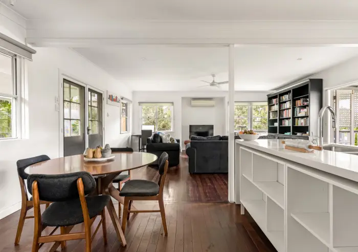 At its heart, a spacious open-plan kitchen, living, and dining area forms the central hub of the home. Generous in scale and filled with natural light, this space has been designed for everyday living and effortless entertaining. French doors open seamlessly to both the side deck and expansive rear entertaining area, enhancing connection to the outdoors and capturing cooling breezes.